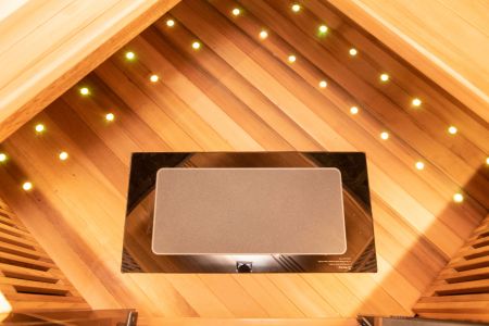 Звук аудіосистеми у сауні відтворюється за допомогою сучасних вібродинаміків. Використання таких динаміків дозволяє отримати якісний звук та естетичний вигляд стелі сауни, тому що немає необхідності робити технологічні вирізи для встановлення динаміків класичного компонування.