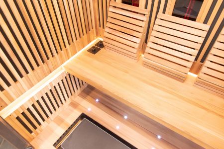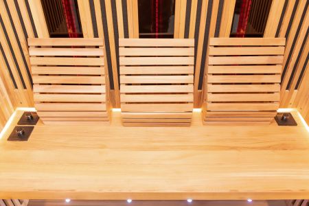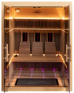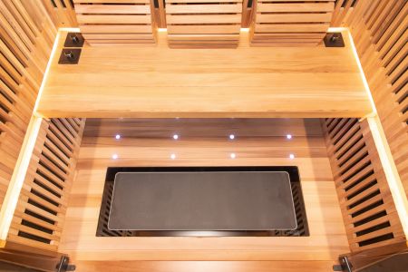 Периметральна система нагріву, зібрана з комбінації 3-х видів інфрачервоних нагрівачів: 1) карбонові нагрівачі нового покоління LOW EMF, мають найменший показник електромагнітного випромінювання з усіх існуючих ІЧ-нагрівачів, ще більш безпечні та довговічні; 2) кварцові нагрівачі мають можливість регулювання потужності регуляторами на лавці під рукою; 3) у підлозі нагрівач підвищеної температури з термоскла, дуже зручний для прибирання.